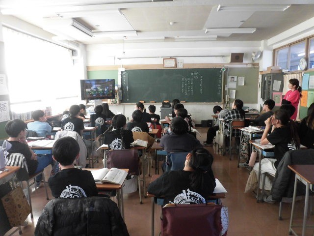 6年生の授業は国語です。古典芸能の能について学習をしています。能についての説明のビデオをみんなで見ています。みんながテレビに集中いています。