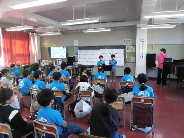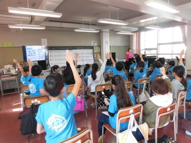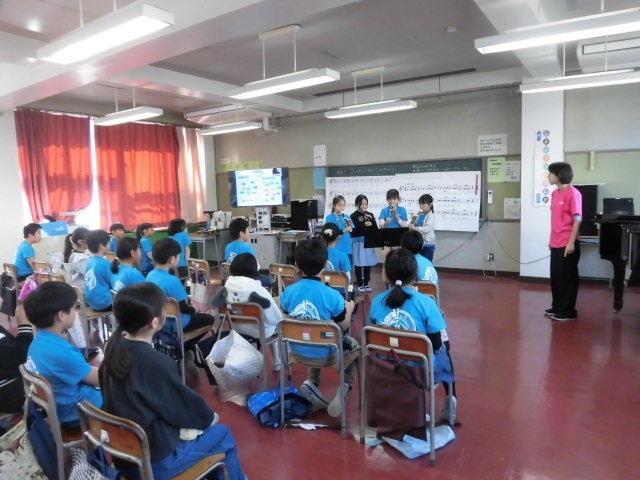 グループごとにみんなの前に出て演奏をしています。次に演奏をするグループを決めるときにも、みんなが手を挙げています。とても意欲的です。