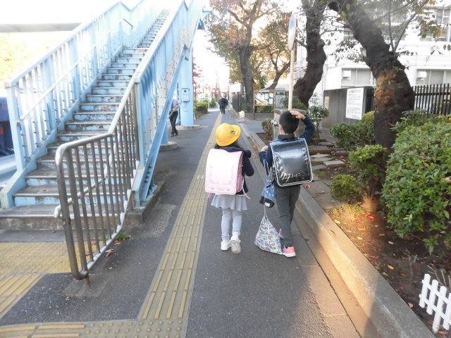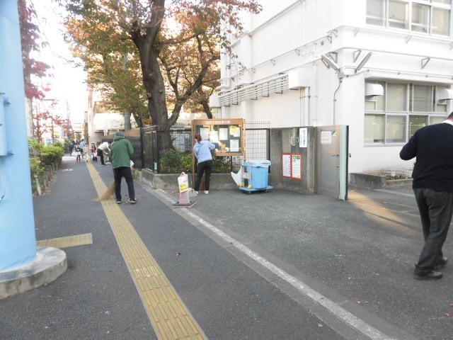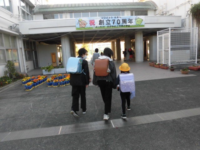 子どもたちの登校の時刻です。子どもたちの登校前、近隣の会社の方々が学校の周辺の落ち葉掃きをしてくれています。おかげで子どもたちの登校のころには、歩道はきれいになっています。