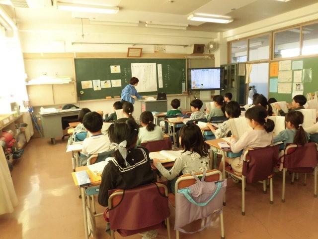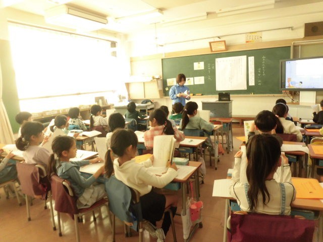 段落ごとにあらすじをまとめています。子どもたちはワークシートに記入をしています。本文を読むときにはしっかりと音読をする子どもたちです。