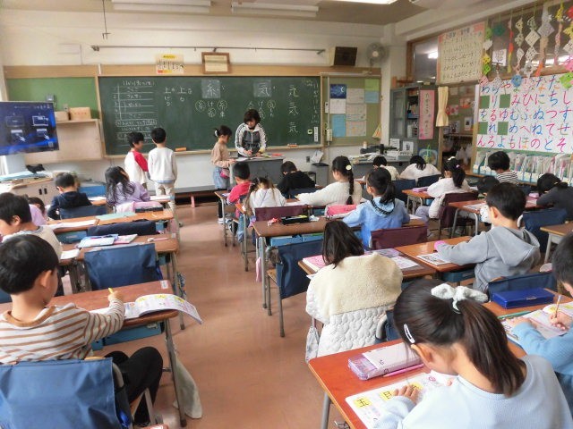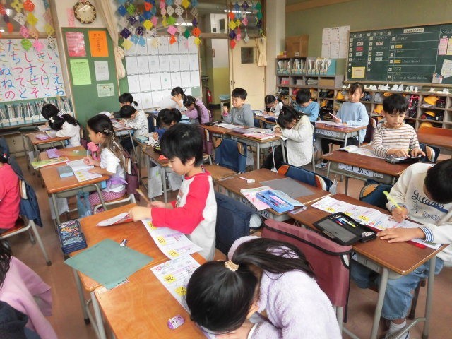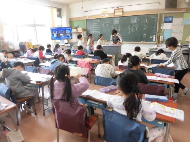 1年生の授業は国語です。漢字の学習をしています。ドリルに記入ができた人は先生に見てもらっています。