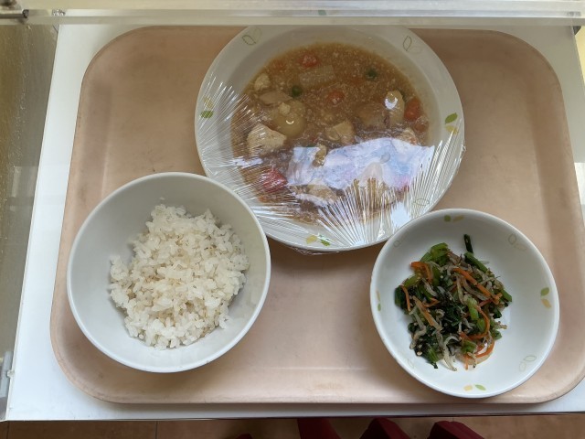 牛乳・麦ご飯・鶏肉とじゃがいものうま煮・小松菜の乾物和え