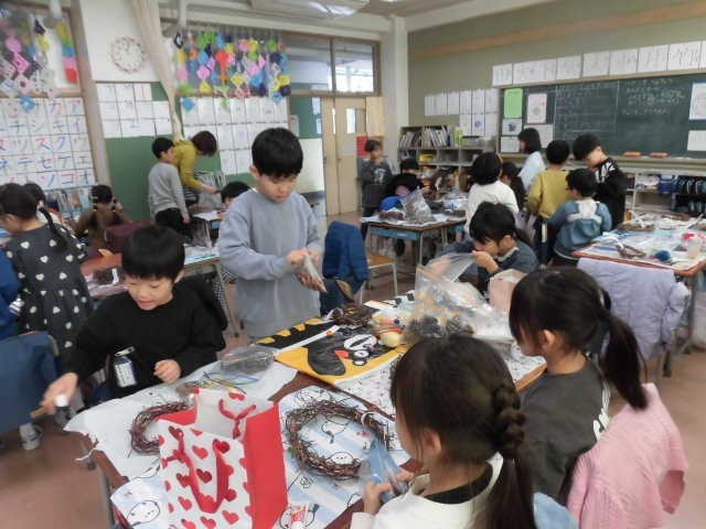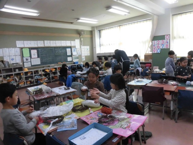 1年生はリースのかざりづくりをしていました。先日、作ったあさがおの弦をリースの形にしたものに、いろいろな装飾をしています。世田谷公園で見つけた木の実や落ち葉を使っている人もいます。家から持ってきたものを使っている人もいます。どんなリースができあがるでしょうか。かわいらしい仕上がりが楽しみです。