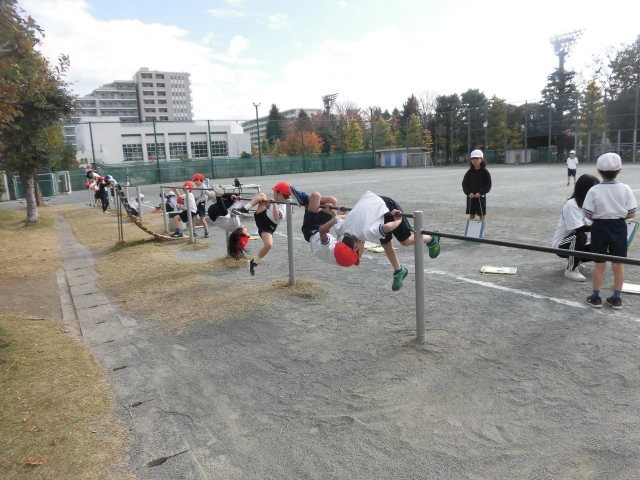 2年生の授業は体育です。鉄棒遊びをしています。子どもたちは身体のいろいろの部位を使ってぶら下がっています。二人で一緒にぶら下がりじゃんけんをしている人もいます。いろいろな鉄棒遊びを考えている子どもたちです。