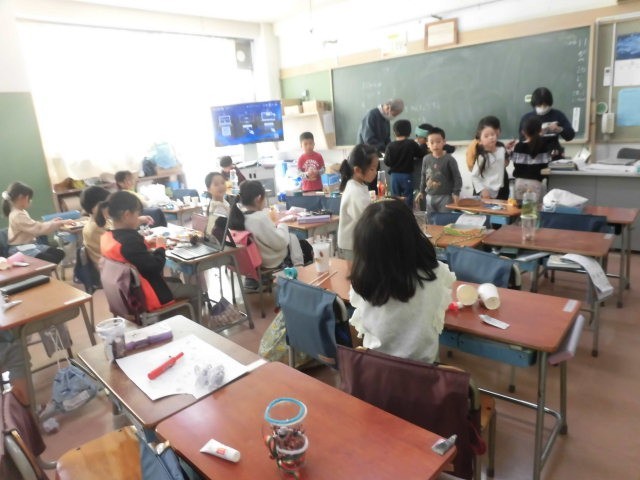 マラカスをつくっている人もいます。やじろべえをつくっている人もいます。いろいろなおもちゃがあります。子どもたちはとても楽しそうに作品作りをしています。