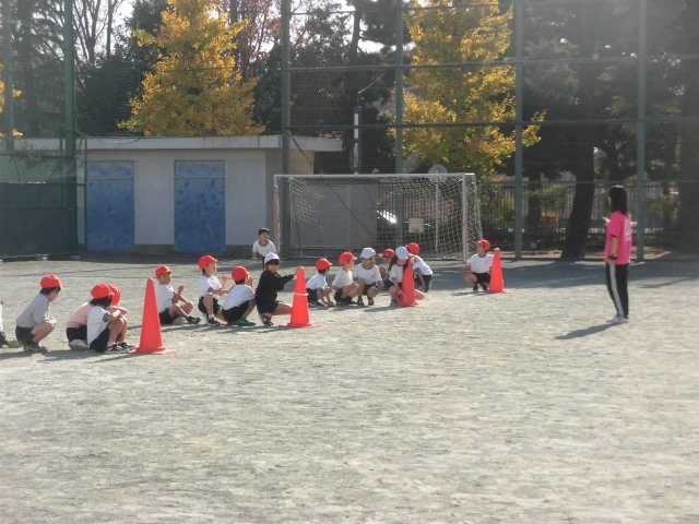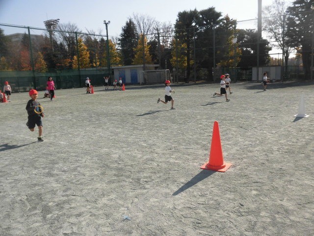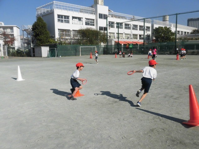 2年生の授業は体育です。折り返しリレーをしています。チームごとに走る順番を決め競争をしています。走っている人は真剣です。順番を待っている人は大きな声で応援をしています。みんなとても楽しそうです。