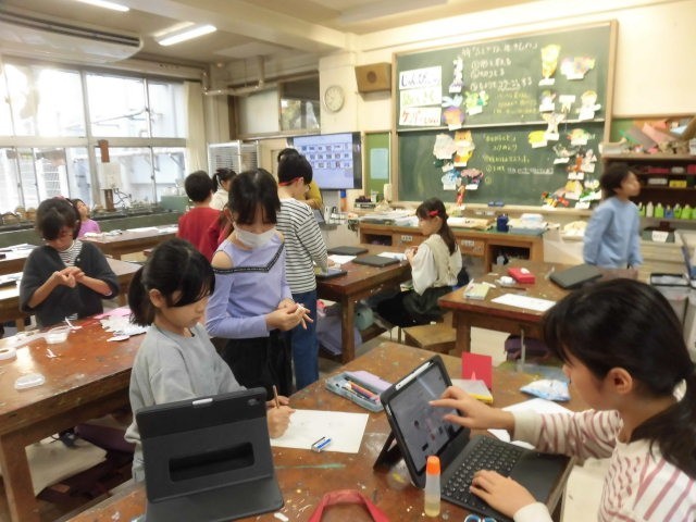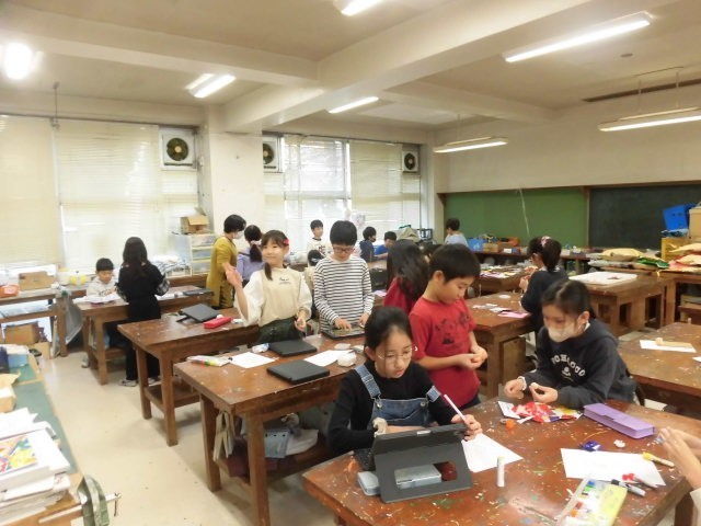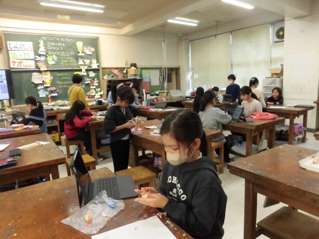 4年生の授業は図工です。学校のいろいろなところに置きたいマスコットをつくっています。子どもたちはいろいろなキャラクターを考えています。校庭に置くもの、図書室に置くもの、職員室に置くもの、場所に合ったキャラクターをつくっています。とても楽しそうに活動している4年生です。