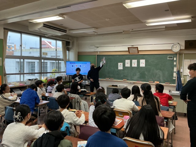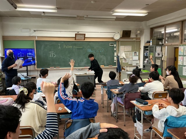 「on」「in」「under」「by」という場所を表す言葉の学習をしました。