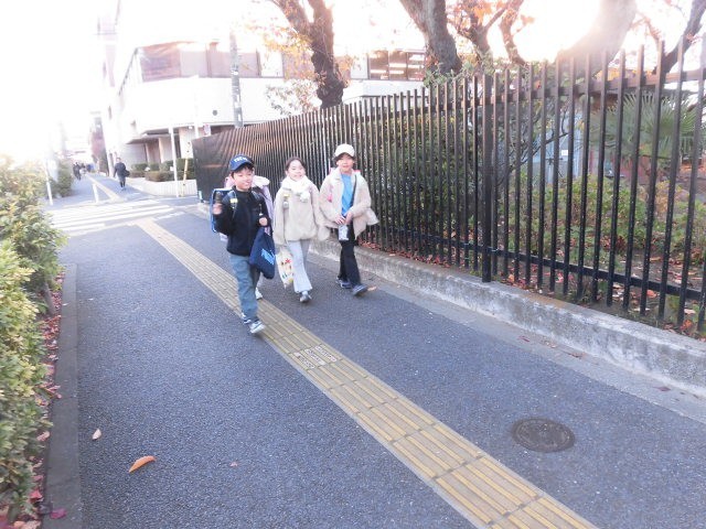 子どもたちが登校してきました。今日はとても寒く感じます。日陰を歩いて登校する人たちはとても寒そうに見えます。