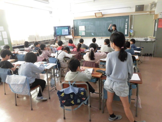 2年生の授業は算数です。オセロのマスのような入れ物に入ったチョコレートの数を求めています。かけ算九九を使った学習です。少し食べてしまったところもあります。どのように求めるか子どもたち考えを発表しています。