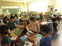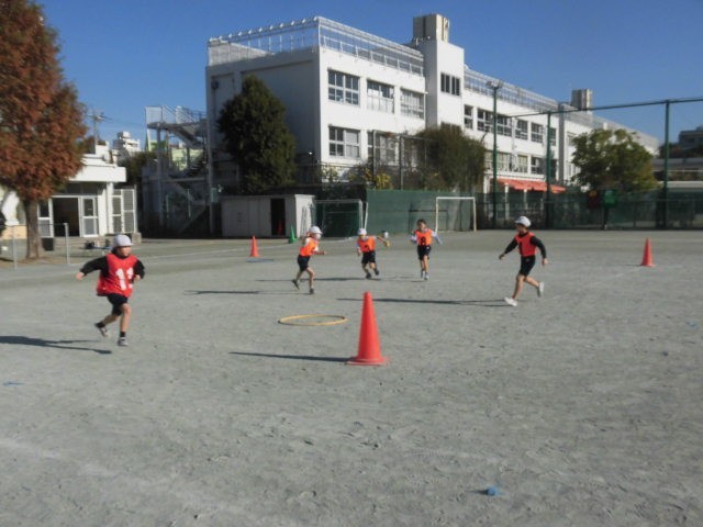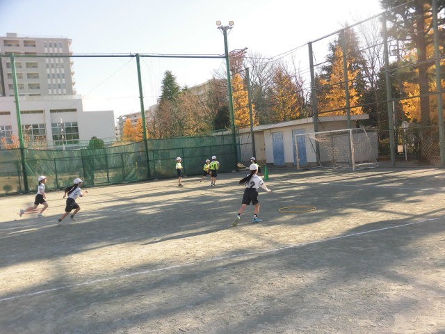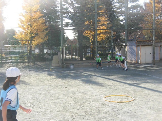 3年生の授業は体育です。ベースボール型のボールゲームです。味方のあげたトスをラケットで打ちます。3年生はしっかりとラケットに当て、ボールを遠くにとばします。守備の人たちは、急いでボールを追っています。みんなで声を掛け合って、楽しそうにゲームをしている3年生です。
