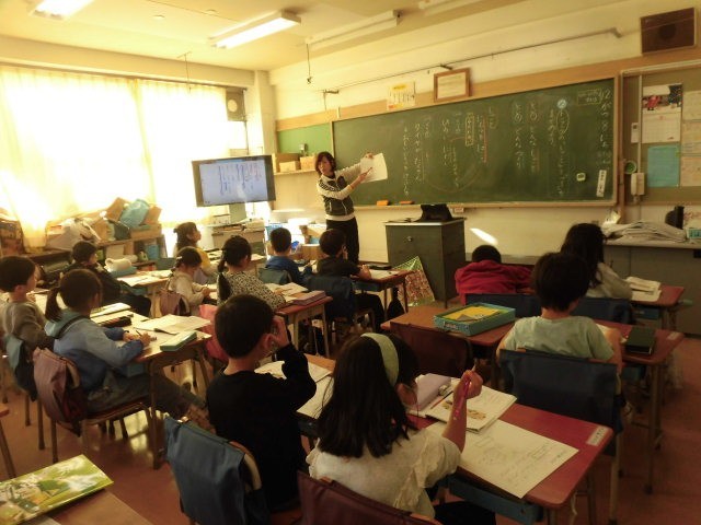 1年生の授業は国語です。説明文「じどう車くらべ」の学習です。