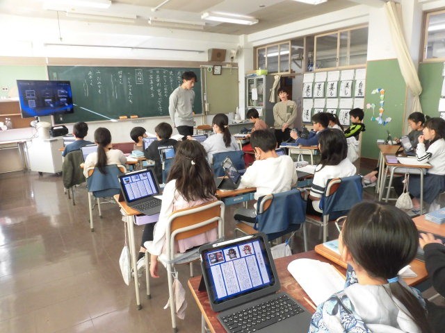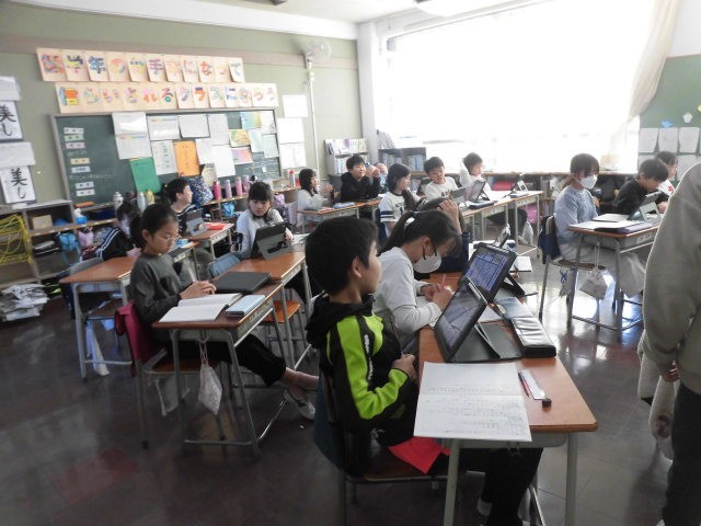 4年生の授業は社会です。一人ひとりまとめた東京都の伝わる文化などについてのまとめを見合っています。友達のまとめについてコメントをノートに書いています。友達の作品のよいところを共有している4年生です。