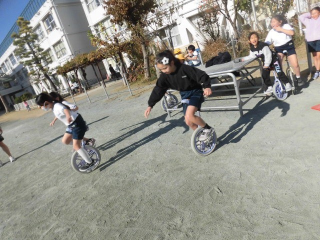 子どもたちはいろいろな遊びをしています。一輪車でリレーをしました。子どもたちのスピードはとても速く、あっという間に置いてけぼりになってしまいました。子どもたちはすごいです。