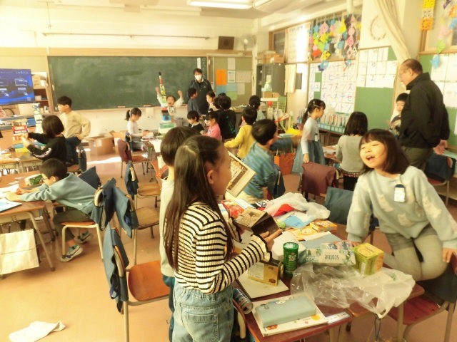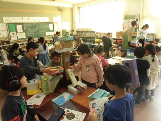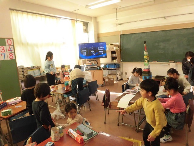 家から持ってきたいろいろな形の箱を組み合わせています。上に乗せていくことができるもの、転がってしまうもの、斜めに落ちていってしまうもの、上に乗せようとしてもうまくいかないものも多くあります。箱をつなげることでいろいろなことに気付いている1年生です。