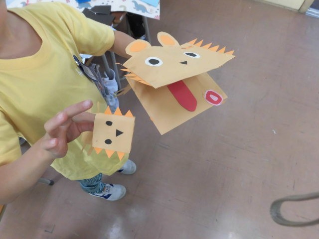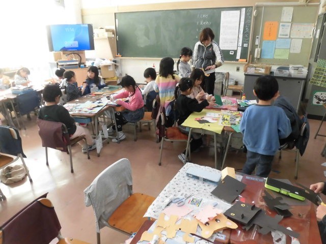 1年生の授業は図工です。手で動かすパクパクさんをつくっています。