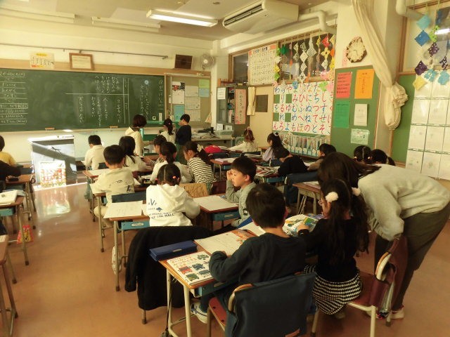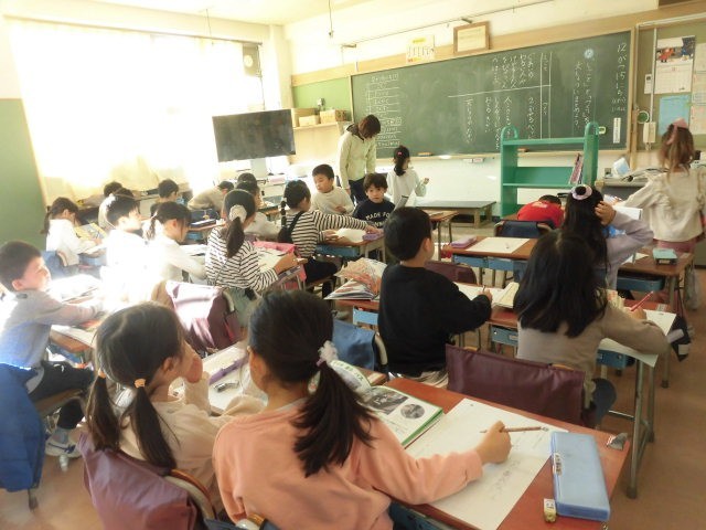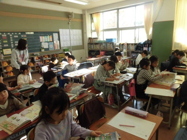 1年生の授業は国語です。説明文「じどう車くらべ」の学習のまとめで、じどう車ずかんをつくる準備をしています。
