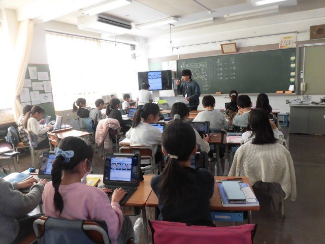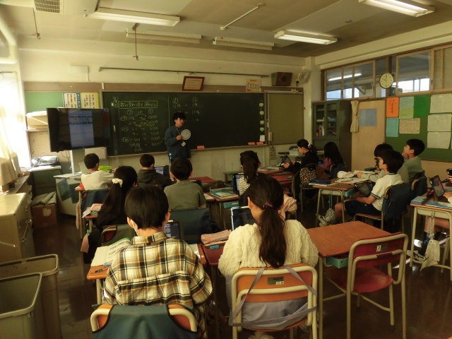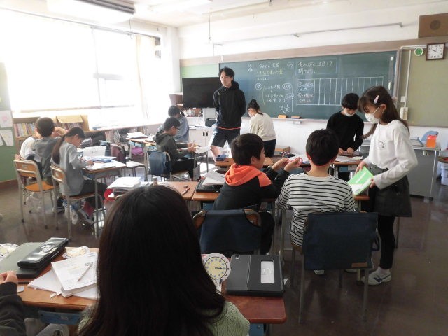 4年生の授業は算数です。数の変化の学習です。伴って変化する二つの数の法則を見つけています。一つのクラスでは、教科書の巻末についているおまけの教材を切り取っています。この教材を使って学習を進めていきます。