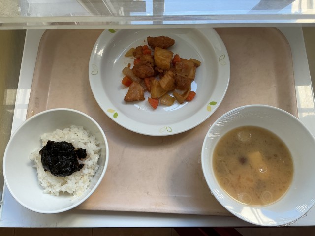 牛乳・麦ご飯・のりの佃煮・じゃがいもと鶏肉の変わり和え・味噌汁