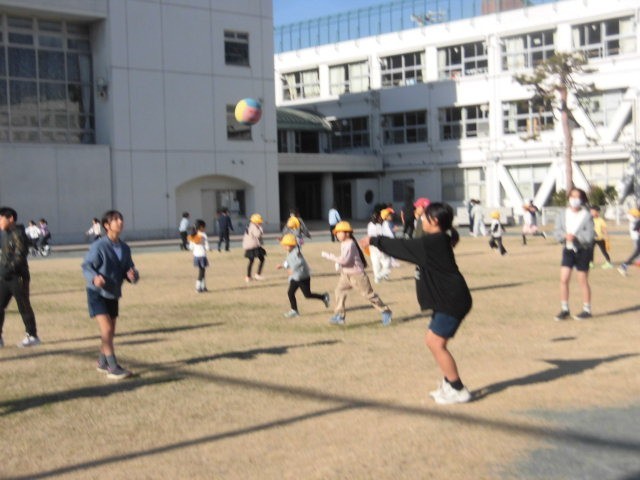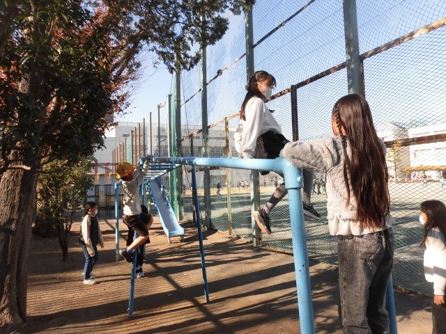 おにごっこやボール遊び、遊具などで遊んでいます。1年生がうんていをしていると2年生や4年生が一緒にうんていをやり始めました。子どもたちはうんていをつかみ手でしっかり自分の体重を支えることができています。すごいです。とても大切な力です。
