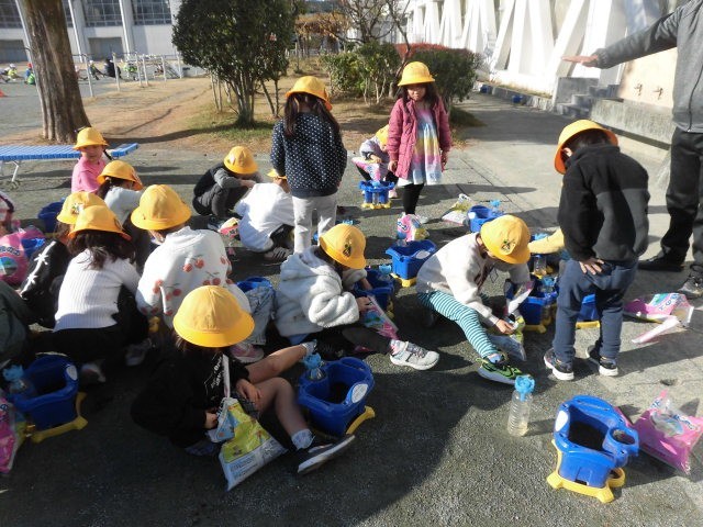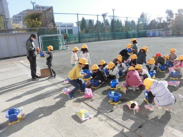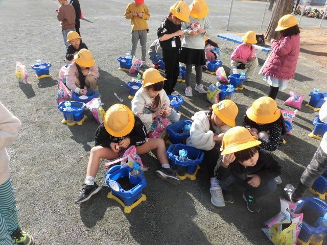 1年生は校庭で球根やパンジーを植えていました。新しい土を鉢に入れています。もらった球根を嬉しそうに土の中に入れています。