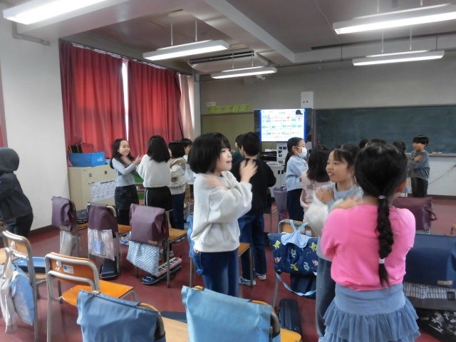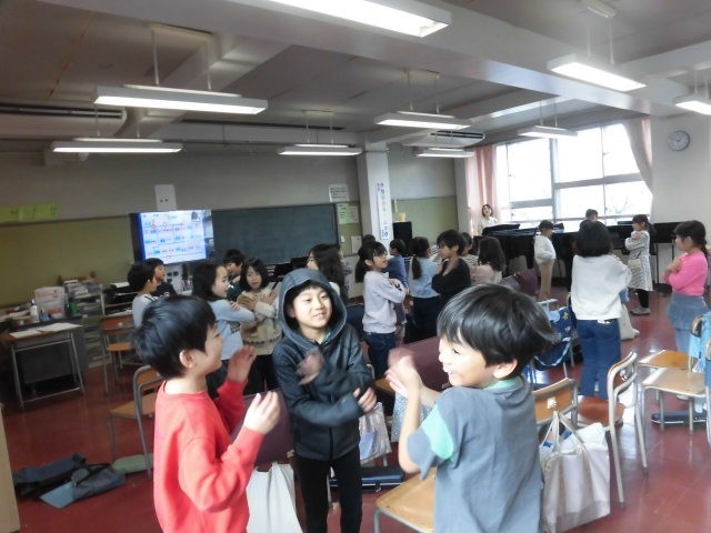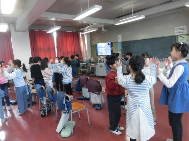 2年生の授業は音楽です。階名で歌を歌いながら、その音に合わせてみんなで動きを合わせています。みんなとても笑顔です。いろいろな動きが加わり、笑いながら楽しそうに取り組んでいます。楽しい雰囲気に包まれている音楽室です。