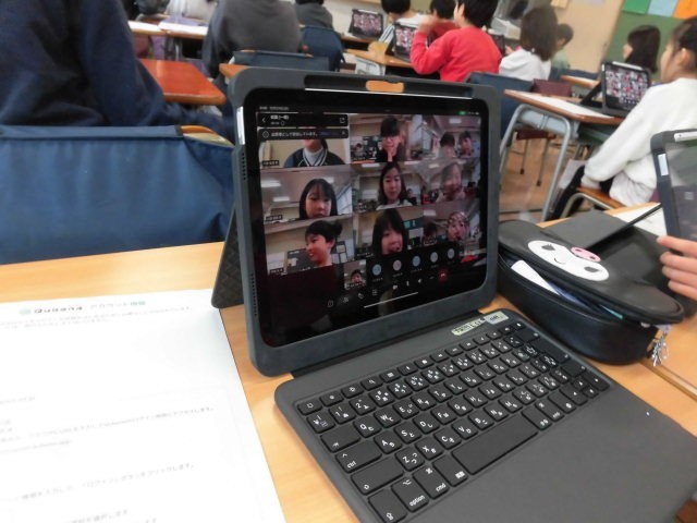 2年生の教室ではタブレットでオンライン会議のやり方の学習をしていました。ICT支援員の先生が来ています。タブレットに自分や友達の顔が出ると、歓声があがりました。みんな友達に向かって手を振っています。とてもうれしそうです。子どもたちはこのアプリもすぐに使えるようになりそうです。