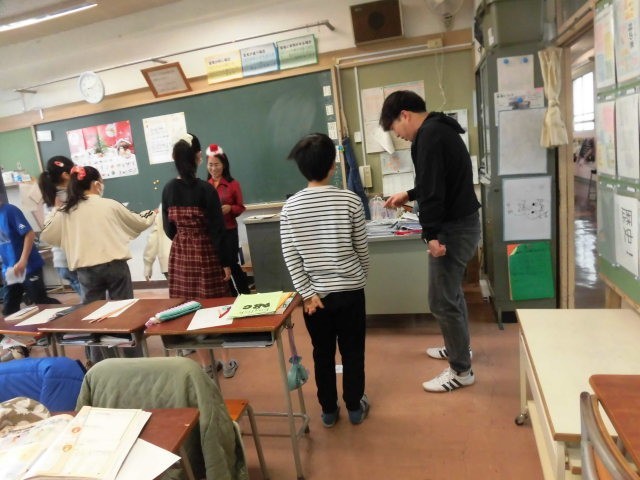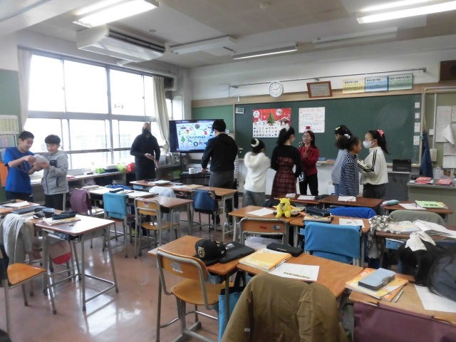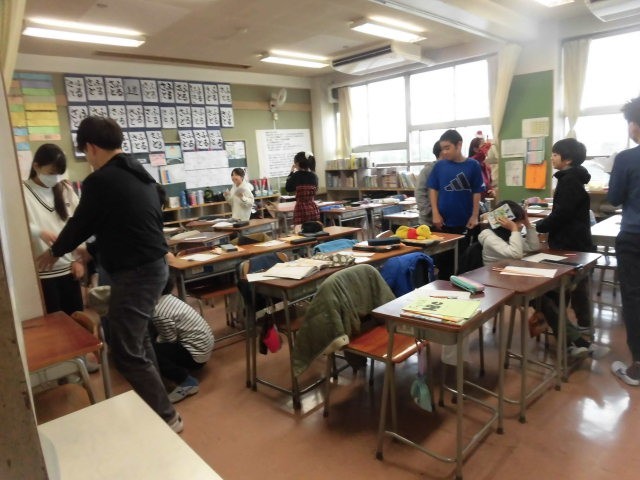 5年生の授業は外国語です。目をつぶった友達に目的物まで道案内をしています。「ゴー ストレイト」「ターン ライト」友達に道案内の声を出しています。目をつぶっている人もとても楽しそうです。
