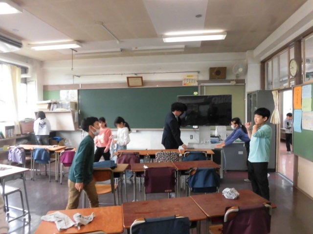 4年生では大掃除をしていました。教室に行ったのが大掃除が終わるころだったので、一度廊下に出していた机を教室に戻しているところでした。教室の床がピカピカになっていました。