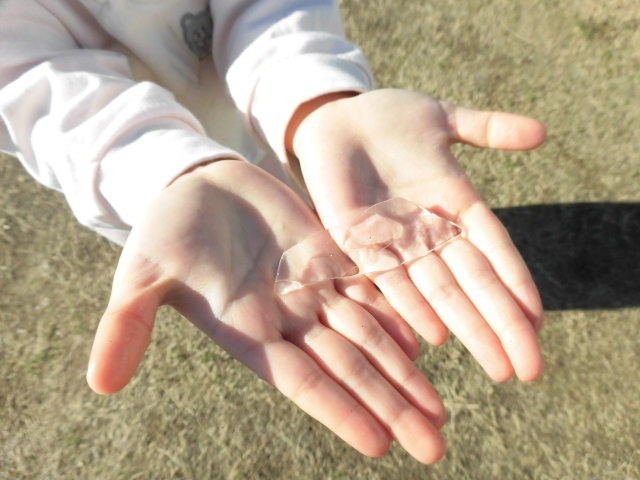 体育の砂場のところにあった氷を見せてもらいました。暑く氷が張っています。朝はとても寒かったのですね。