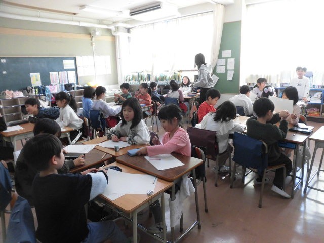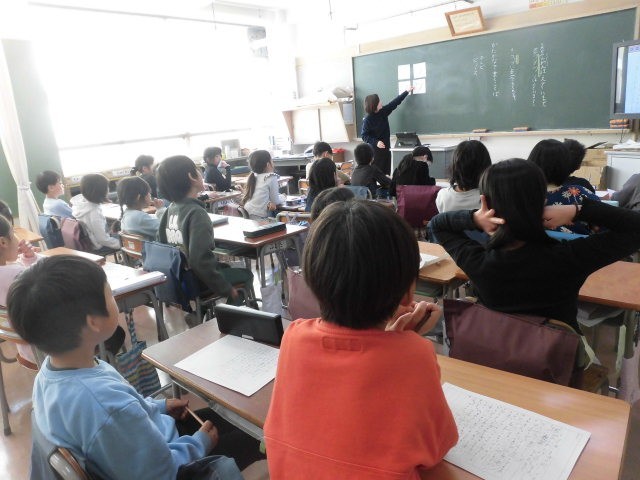2年生の授業は国語です。カタカナで書く言葉の学習をしています。似たような形のカタカナやカタカナの書き間違いについてみんなで確認をしています。そのあとは、各自思いつくカタカナで書く言葉をワークシートに書き出していました。