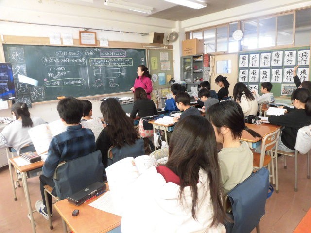 5年生の授業は算数です。割合の学習の確認をしています。冬休みがあって忘れてしまった人もいるかもしれません。わたしは小学生の時、この単元でつまずいてしまったことを覚えています。普段の生活でも使うことなのでしっかりと理解してほしいです。