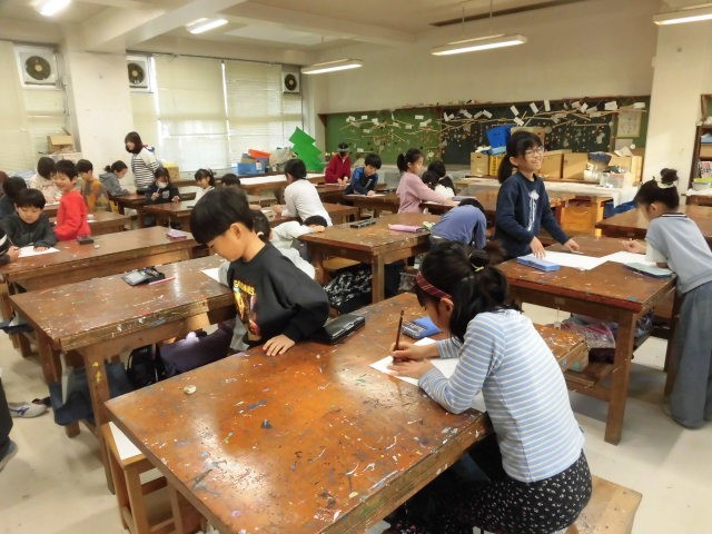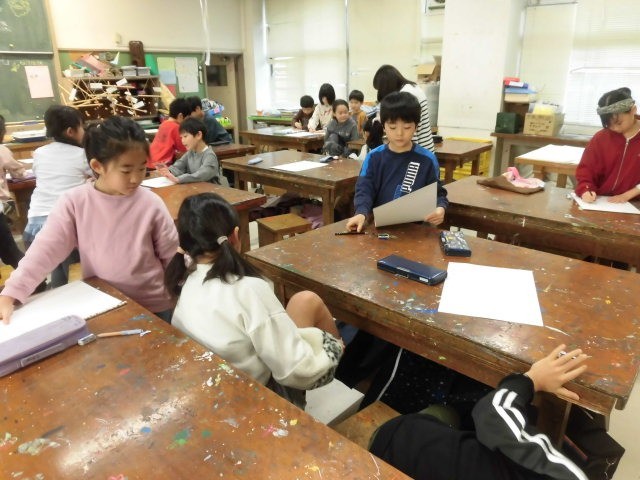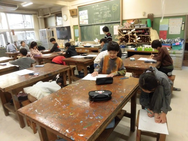 2年生の授業は図工です。大きな画用紙に自分の手や足を置き、鉛筆で形をとっています。「右手の形を左手でかくのが難しいよ。」そう言っている人もいます。靴下を脱いで足型をとっている人は、いつもやらないことだからかとても楽しそうな表情をしています。これがどんな作品につながるのでしょうか。楽しみです。