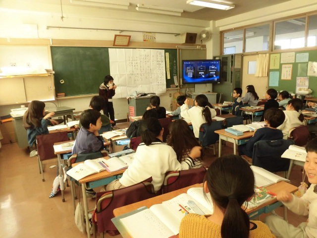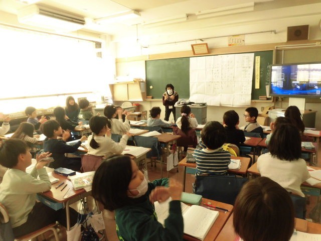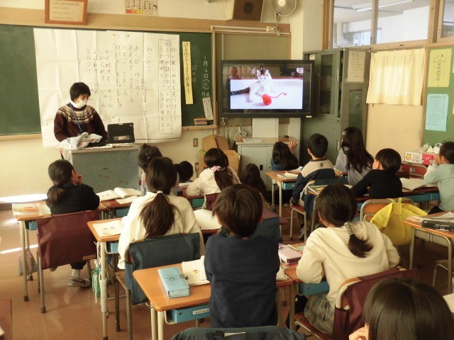 猫を題材にした詩をみんなでよんでいます。テレビで猫がかわいらしく動く姿をみんなで見ています。詩で表現されている様子を実際のネコの動きと重ね合わせています。子どもたちは猫の気持ちになって詩をよんでいます。