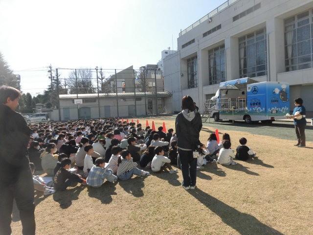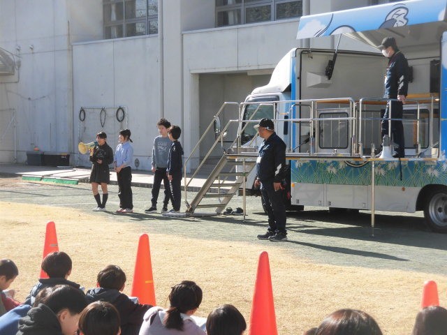 区の防災係の方にいらしていただき、5年生が起震車の体験をしました。子どもたちは震度7を体験し、感じたことをみんなの前で発表しました。感じた地震の怖さを全校のみんなに伝えました。