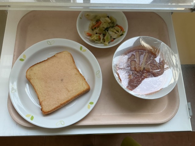 牛乳・タラモトースト・かぶ入りミネストローネ・茹で野菜の玉ねぎドレッシング