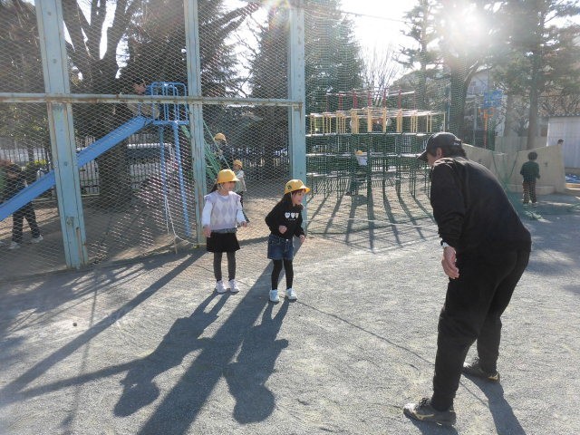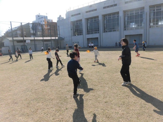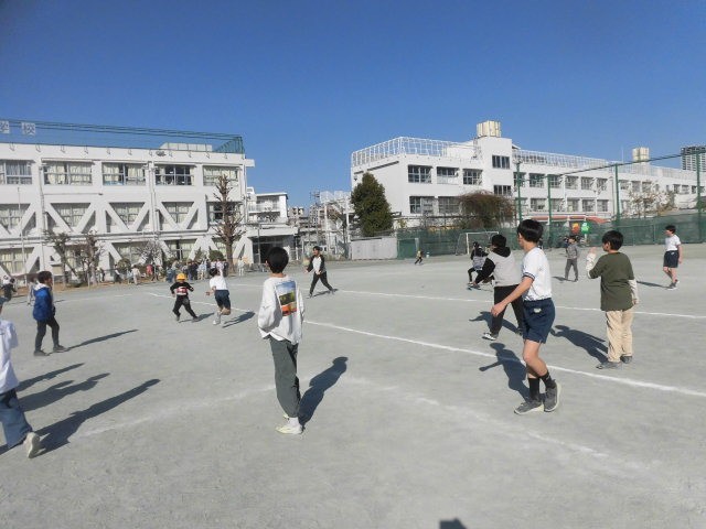 6年生はボール投げ遊びをしています。2年生もドッジボールをしています。1年生は先生と長縄で郵便屋さんをしています。郵便屋さんの落とし物を7枚も拾いました。
