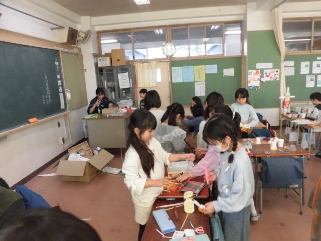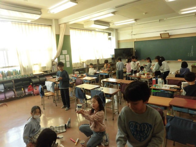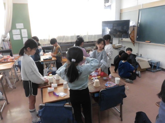 紙コップとペットボトルのふたでけん玉をつくっているグループがあります。輪ゴムを使って飛びだすおもちゃをつくっているグループもあります。いろいろなおもちゃがあります。