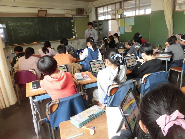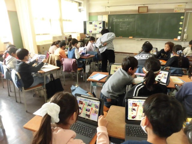 東京の伝統工芸の学習です。東京染小紋の作り方の順序を考えています。タブレットに送られた工程を正しい順序に並べ替えています。子どもたちは悩みながら矢印を入れていきます。子どもたちにとって、あまり馴染みのないものなので、難しいのかもしれません。
