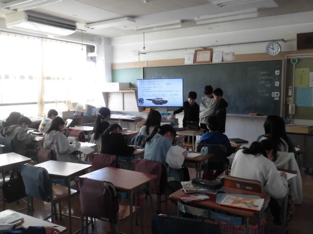 6年生の授業は社会です。日清戦争や日露戦争についてグループごとにまとめた発表をみんなで見ています。二つの戦争について自分たちで調べて学習を進めています。発表の仕方もグループによってさまざまでした。