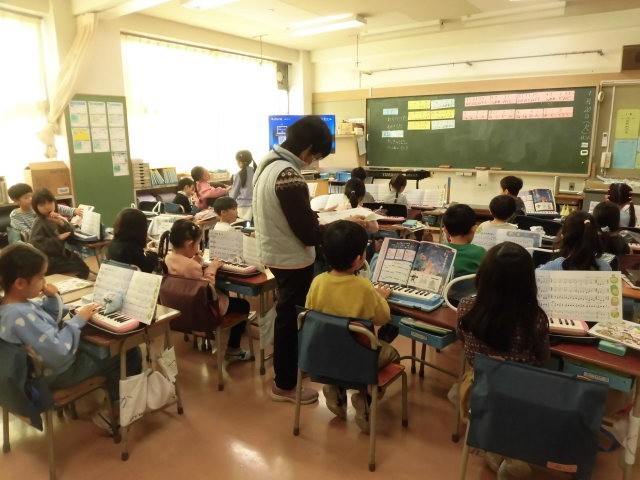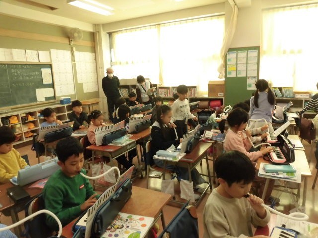 鍵盤ハーモニカで「こいぬのマーチ」を演奏しています。子どもたちは各自で練習をしています。もう立派に演奏することができる人がたくさんいます。子どもたちは繰り返し何度も練習をしていました。