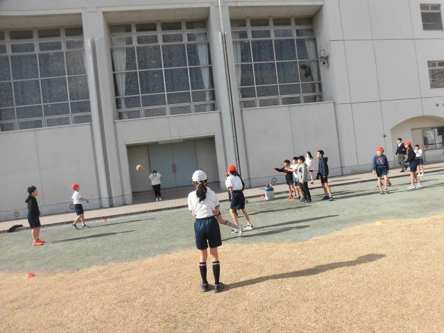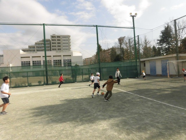 冷たい北風が吹いていますが、子どもたちが校庭に出てきました。子どもたちは元気です。校庭を走り回っています。