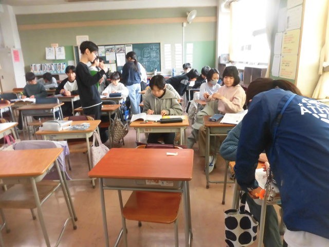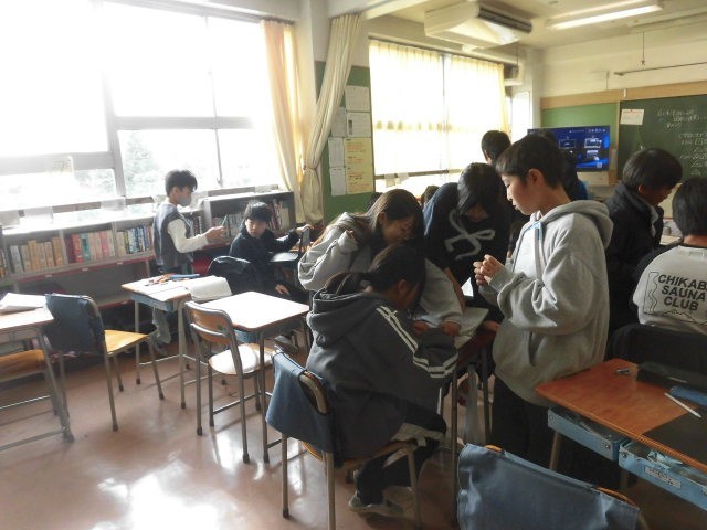 問題を一人ひとりが解いています。つまずいてしまった人は、分かる人に聞いています。みんなで教え合っている6年生です。自然に教え合うことができる雰囲気の教室です。