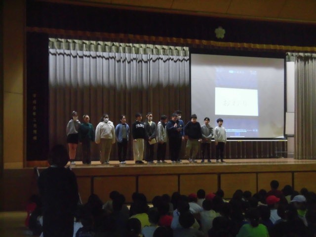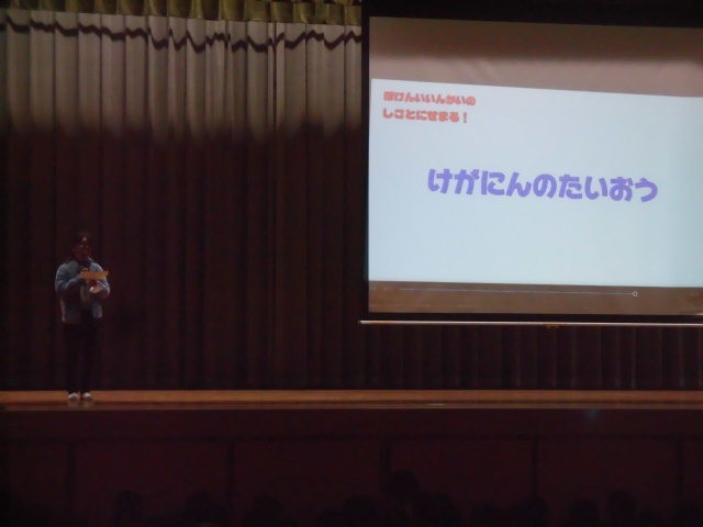 今日の朝の活動は保健委員会の発表です。保健委員会の人たちの仕事内容をみんなに伝えています。