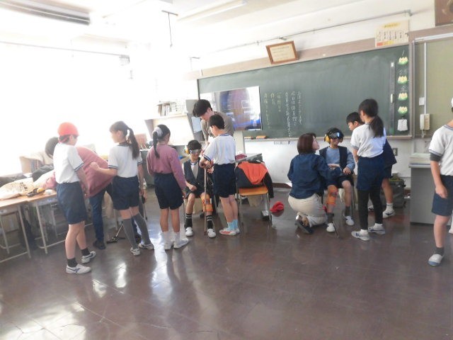 4年生の授業は総合です。福祉体験学習です。あんしんすこやかセンターの方々にいらしていただき、高齢者体験をしています。