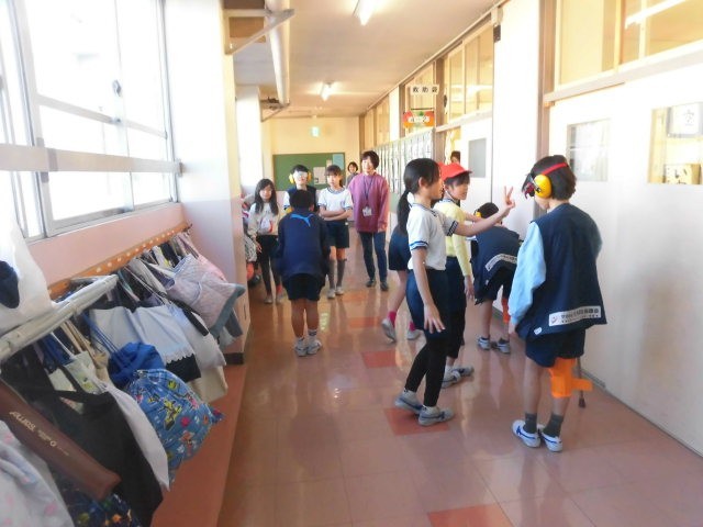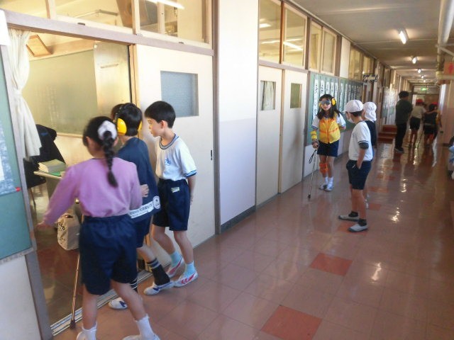 重りのついたベスト、視界の変わる眼鏡、動きが制限されるサポーターなど、普段の動きやすさと異なる感じで廊下にある障害物をさけて歩いています。