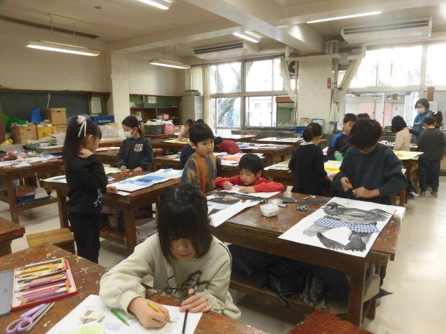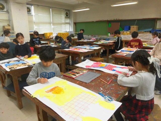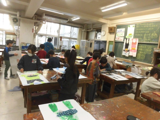2年生の授業は図工です。自分の手形や足形を使って落ちてきたオニを描いた作品の仕上げになっています。
