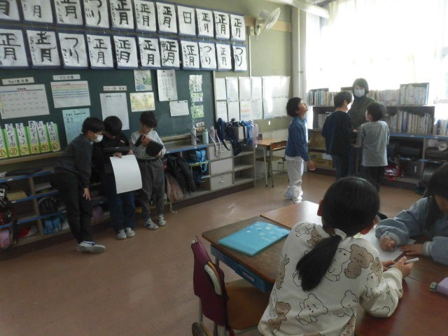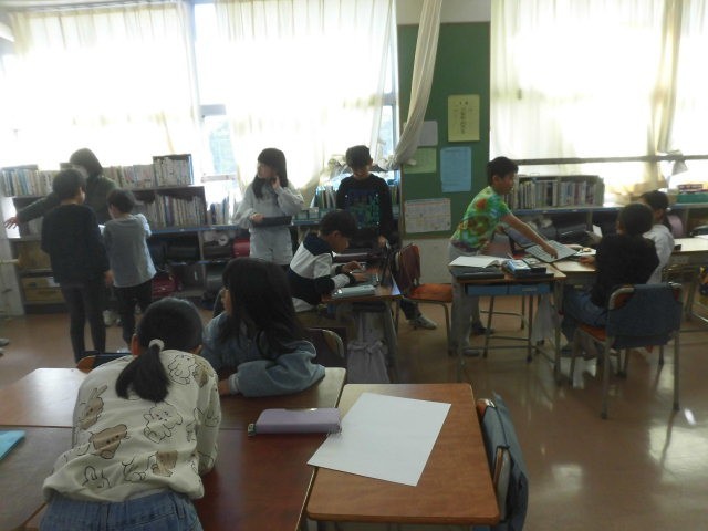 3年生の授業は総合です。来週に行うホームワークビレジの施設を案内する準備をしています。グループごとにその練習をしています。