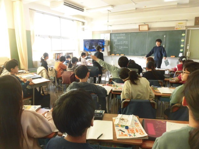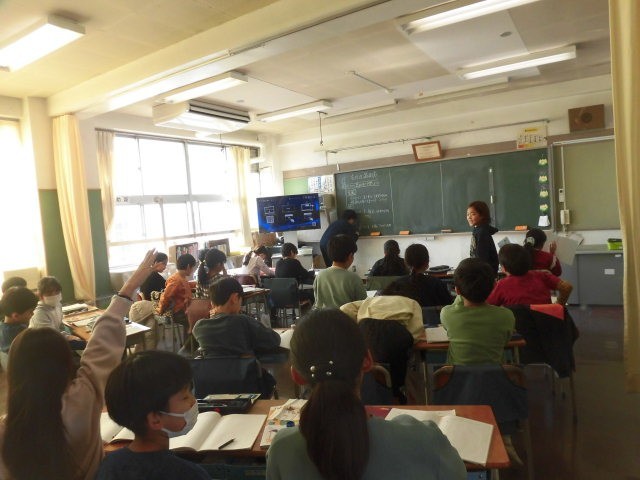 4年生の授業は理科です。熱の伝わり方の学習です。金属や水や空気に熱を加えた場合、どのように伝わっていくのかを予想しています。