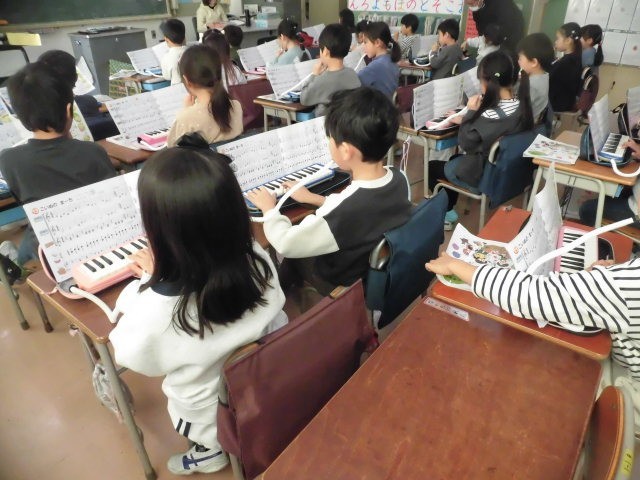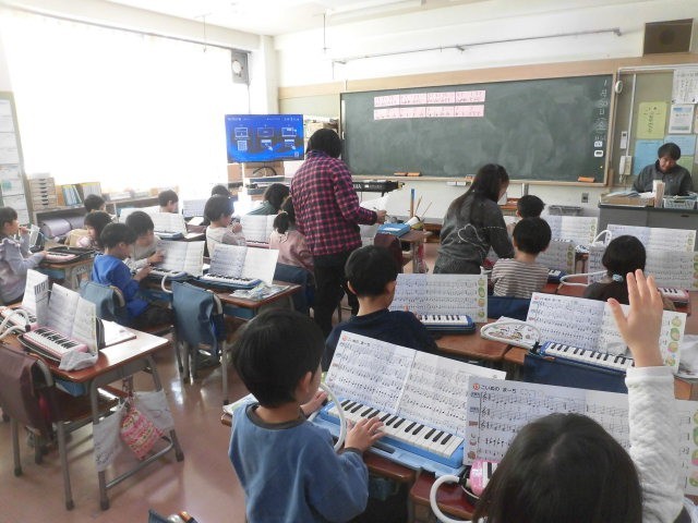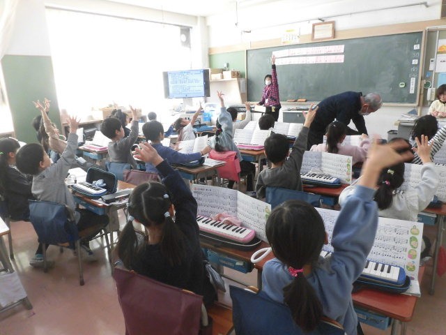1年生の授業は音楽です。鍵盤ハーモニカの学習です。はじめにつかう指の確認をしています。メロディに合わせて上にあげた手の指を動かしています。
